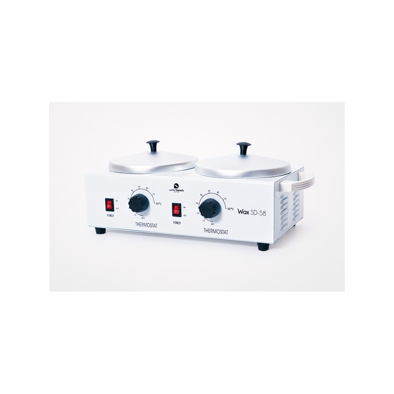 Fundidor de cera con dos depósitos independientes. Dispone de dos tapaderas para conservar el producto en optimas condiciones. Calentamiento por reguladores independientes en cada depósito, lo que permite tener diferentes temperaturas de la cera. - Voltaje: 220/240 V. - Frecuencia: 50/60 Hz. - Potencia: 100 W. - Capacidad: 2 x 500 gr. - 2 Ollas independientes. - 2 interruptores ON/OFF con luz. - 2 Reguladores de temperatura. - 2 Asas de transporte y doble tapa. - Peso: 1.460 gr.