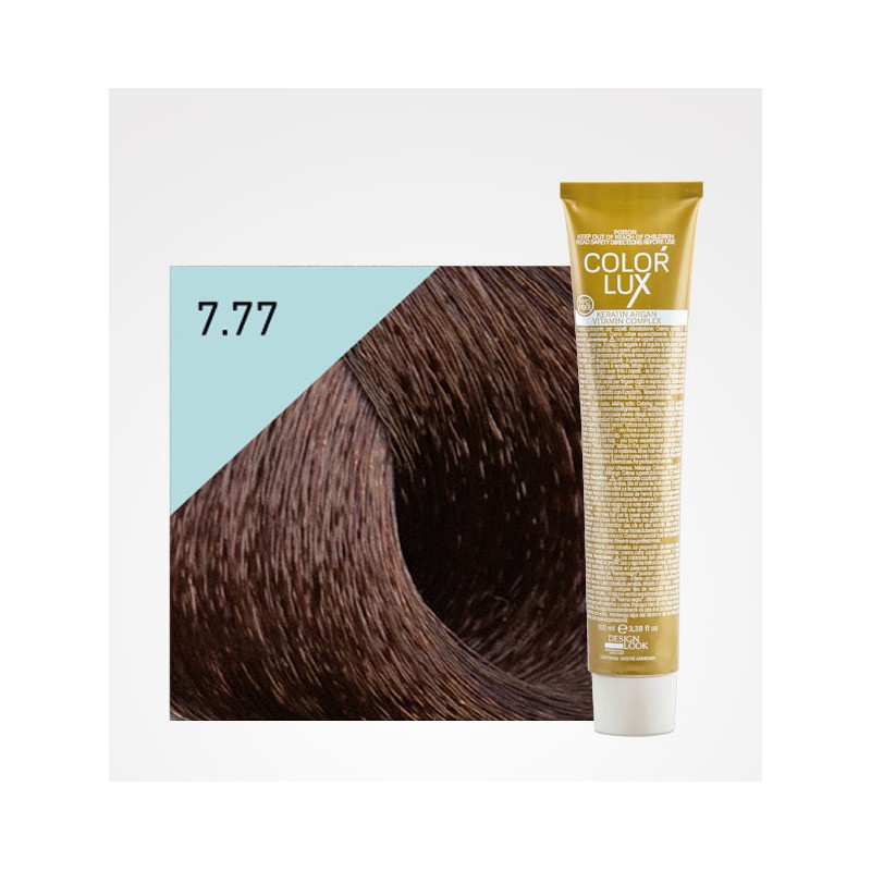 La crema colorante Color Lux es la innovadora coloración permanente de Design Look potenciada con Vitamin Complex, con acción altamente acondicionadora, regeneradora y protectora del cabello. Su fórmula exclusiva a base de Keratin y Argán con propiedades abrillantadoras, emolientes y antioxidantes, y su complejo vitamínico, con propiedades acondicionadoras, hidratantes y calmantes.Garantiza el máximo respeto por la estructura del cabello, volviéndolo suave, luminoso e hidratado. El uso de pigmentos colorantes de altísima calidad, permite la total cobertura de las canas, realizando colores uniformes y duraderos, con reflejos intensos y vibrantes.