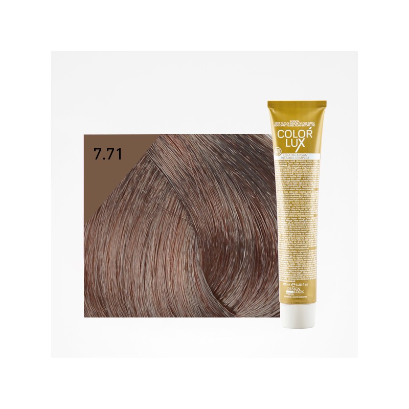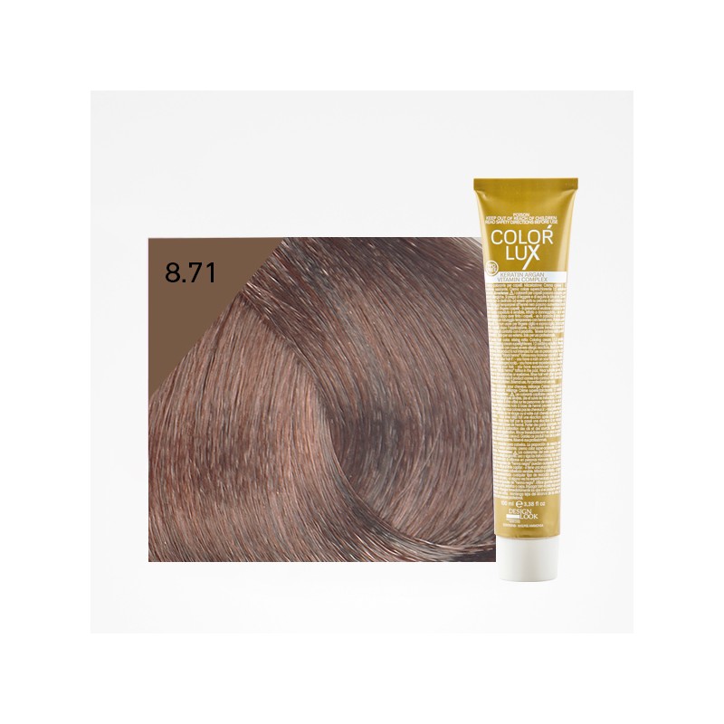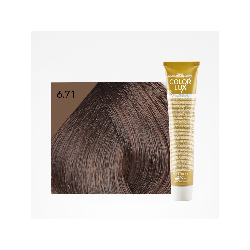 Fórmula de Keratin y Argán con propiedades abrillantadoras, antioxidantes, su complejo vitamínico, con propiedades acondicionadoras, hidratantes y calmantes. Tono Chocolate Frio Crema Colorante Color Lux Design Look 6.71, 7.71 y 8.71.