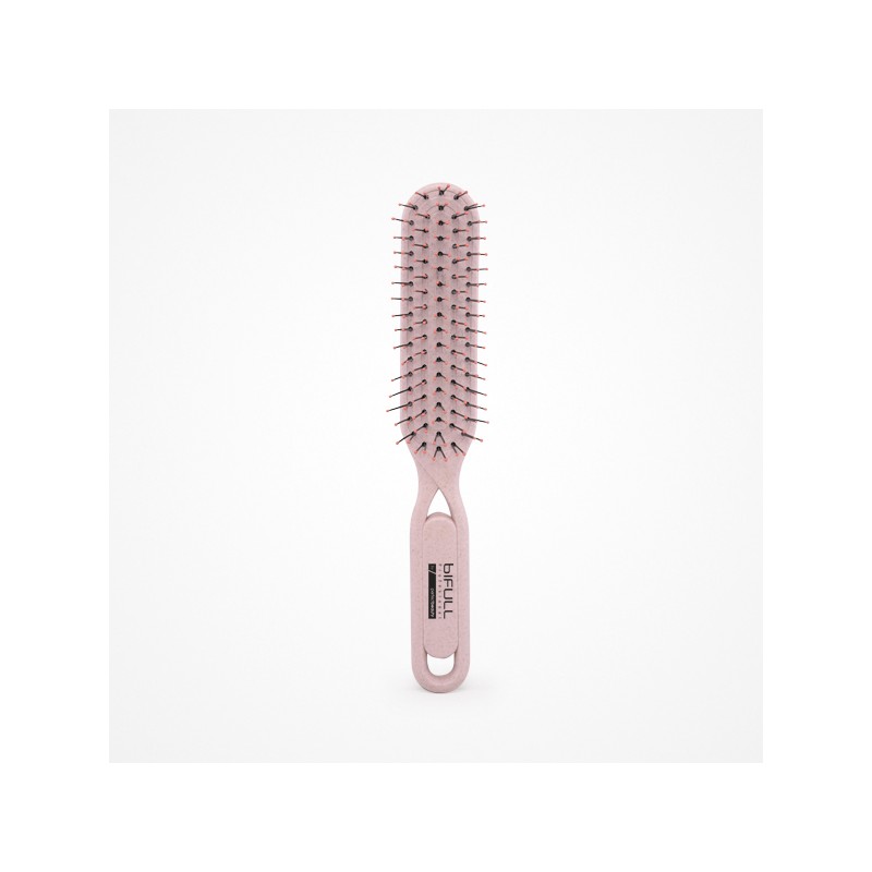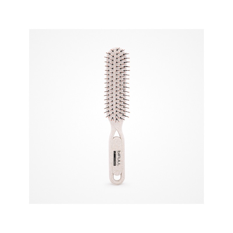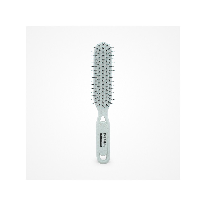 Cepillos biodegradables fabricados a partir de materiales orgánicos, ecológicos y con bajo contenido en carbono. El ancho del cepillo es de solo 35 mm, tiene 84 orificios con 168 cerdas. Además, el cuerpo del cepillo puede soportar 80ºC, mientras que las cerdas de nailon pueden soportar 160ºC. Sus cerdas en forma de V están especialmente diseñadas para desenredar todo tipo de cabello y masajear el cuero cabelludo sin tirones. Cerdas largas que llegan a todas las capas del cabello acortando el tiempo del cepillado. Eliminan suavemente los nudos. Cerdas de nailon. Curvado